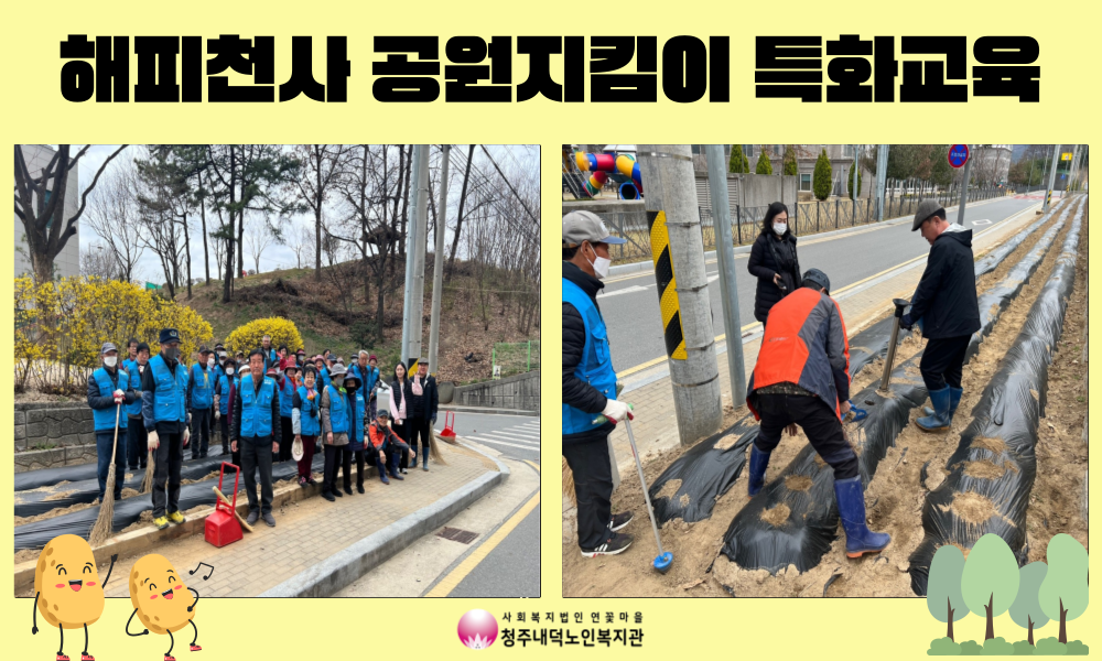 2024년 3월 25일 청주내덕노인복지관에서 오전 9시부터 12시까지 해피천사 공원지킴이 참여자 42명과 함께 특화교육 “어르신들, 감자합니다”가 진행되었습니다~! 매년 어르신들과 함께 특화교육을 진행하고 있는데요, 이번년도에는 감자심기 행사로 진행하였습니다. 교육을 통해 공원지킴이 참여자들의 활동역량을 강화시키고 공원 관리 활동에 대한 이해도를 높일 수 있었습니다. 또한 감자 수확 시 지역사회 다른 기관과 연계하여 수확할 예정입니다. 앞으로도 어르신들을 위한 다양한 활동을 위해 노력하겠습니다~! 많은 관심 부탁드립니다 ~!