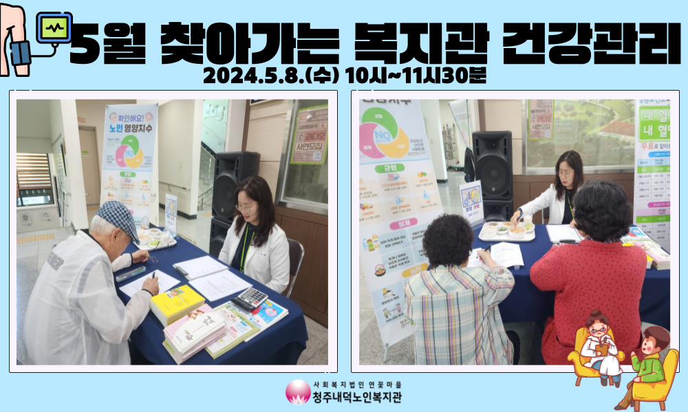5월 찾아가는복지관 건강관리로는 청주내덕노인복지관 로비에서 혈압 및 혈당 검사와 영양상담이 진행되었습니다.