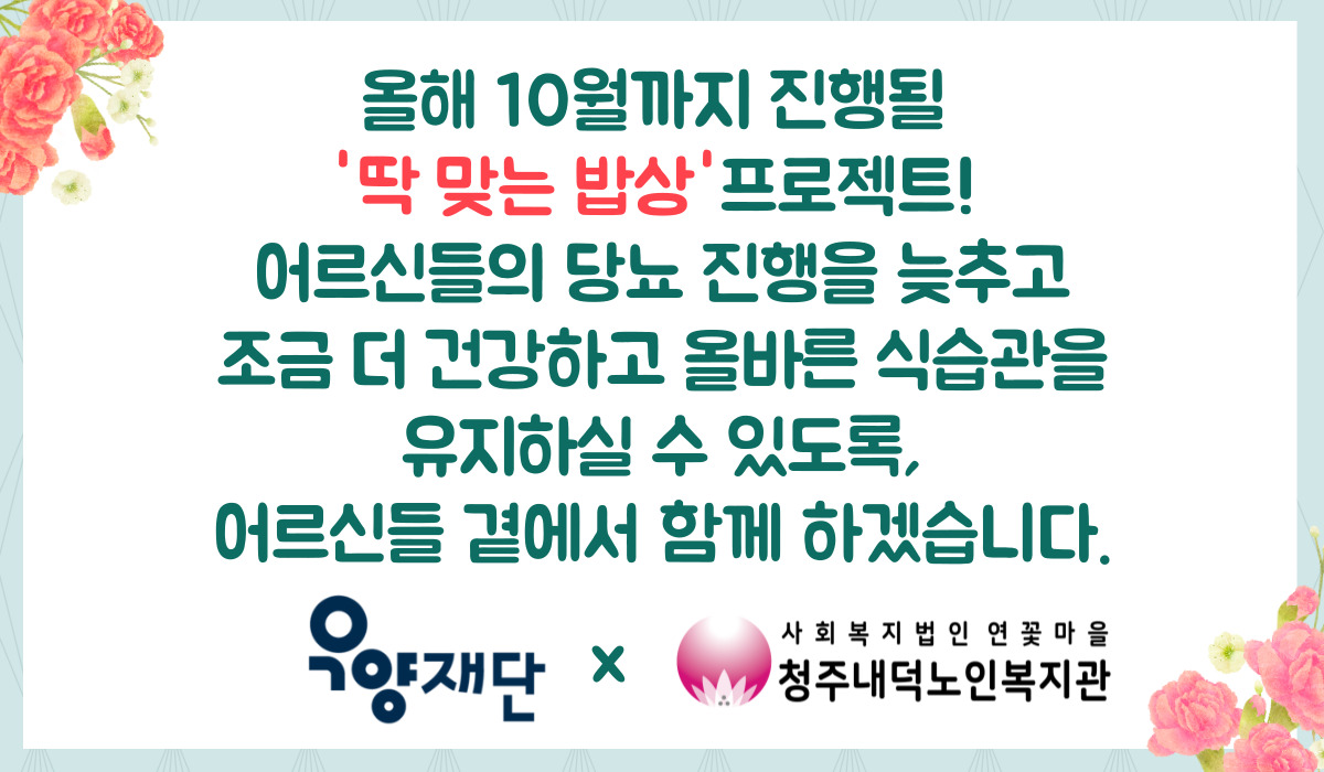청주내덕노인복지관에서는 올해 우양재단에서 지원하는 노인성 질환 맞춤형 먹거리 지원사업 "딱 맞는 밥상" 프로젝트 수행 기관으로 선정되어 05.29.(수) 1회기 프로젝트를 시작하였습니다.