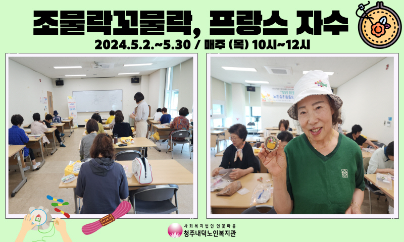 조물락꼬물락, 프랑스자수 프로그램에 많은 관심과 응원부탁드립니다. 청주내덕노인복지관 문화복지과 문유진사회복지사 (문의전화) ☎ 216-9810