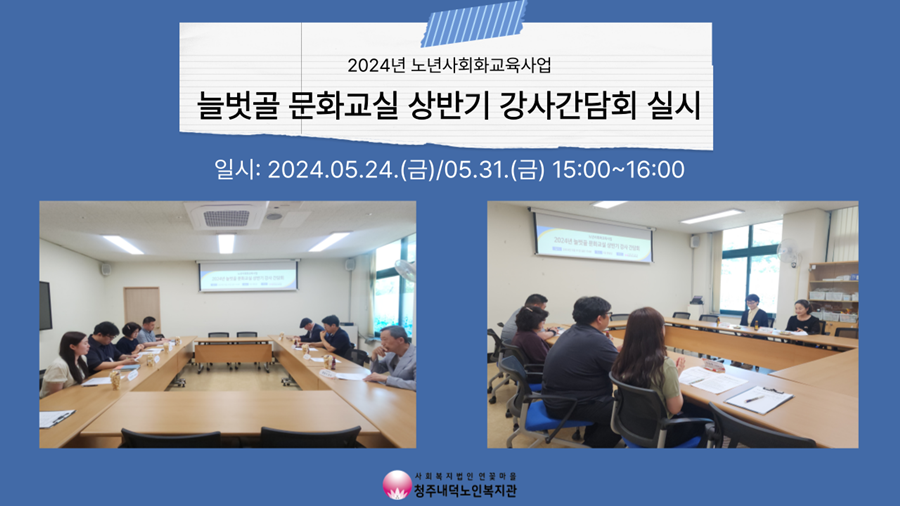 5월 24일(금)과 5월 31일(금)에 복지관 1층 상담실에서 2024년 노년사회화교육사업 늘벗골 문화교실 상반기 강사 간담회를 진행하였습니다. 강좌를 진행해주시는 강사님들이 참석한 가운데 운영일정, 공지사항 안내 및 강사님들의 의견 및 건의사항을 들어보았습니다. 수강생분들의 얘기, 강좌의 방향성, 홍보 방안 등 다양한 의견이 들이 제시 되었으며, 직접 수업을 진행하면서 생각하신 강사님들의 의견을 청취할 수 있는 뜻깊은 자리였습니다. 바쁜 와중에도 참석해주신 강사님들께 다시 한 번 감사드리며, 앞으로도 이용자분들이 늘벗골 문화교실을 즐겁게 이용하실 수 있도록 노력하겠습니다! |