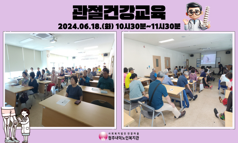 2024년 6월18일(화) 10시30분~11시30분 청주내덕노인복지관 2층 배움방에서 관절건강교육을 진행하였습니다.
