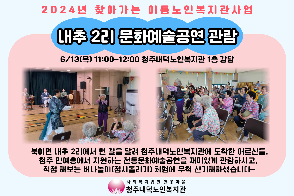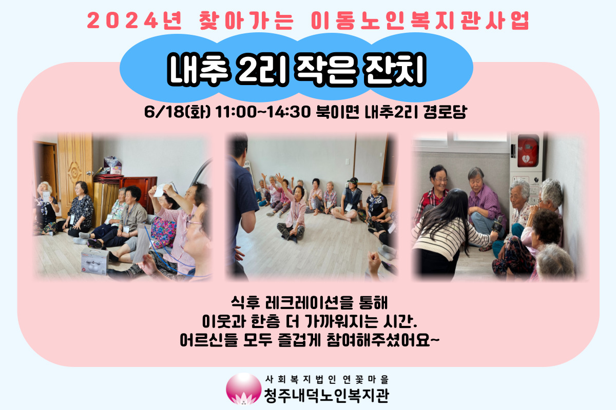 청주내덕노인복지관은 찾아가는 이동노인복지관 사업을 통해 청원구 농촌지역 어르신들의 복지체감도 향상을 위한 다양한 프로그램을 추진해 나가겠습니다~!