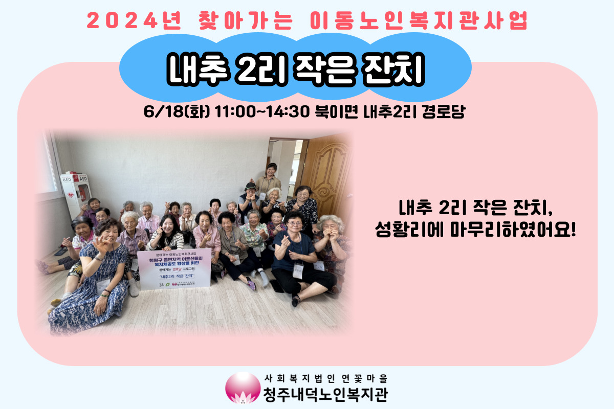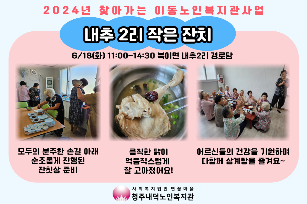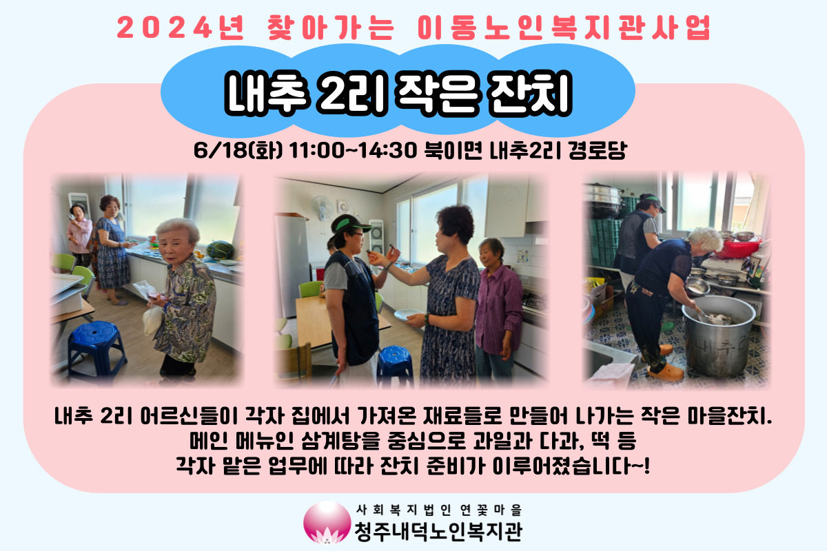 그리고 6/18(화) 내추2리 경로당에서는 주민분들의 적극적인 참여 하에 작은 마을 잔치가 진행되었습니다. 마을공동체를 활성화시킴으로써 지역 내 사회적 고립가구를 발굴하기 위한 취지에서 실시된 프로그램으로 많은 어르신들이 다함께 모여 삼계탕을 나눠 드시고 레크레이션에 참여하는 등, 알차게 잔치를 즐겼습니다.