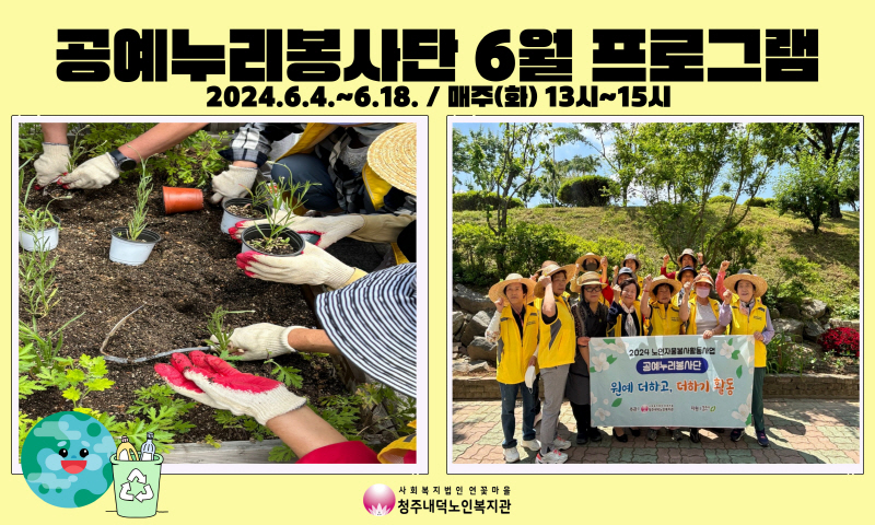 청주내덕노인복지관에서 진행하는 2024년 노인자율봉사활동사업 공예누리봉사단이 6월 원예교육과 함께 다양한 꽃을 복지관 주변에 심거나 잡초를 정리하는 등 원예봉사활동을 진행하였습니다. 공기정화 및 오염물질을 흡수해 환경에 도움이 되는 식물에 대해 이해해볼 수 있었으며, 복지관 주변 화단을 다양한 종류의 꽃과 모종으로 가득 채우고 더운 날씨에도 잡초를 정리하며 더 화사하고 환경을 가꿀 수 있는 기회를 가졌습니다.