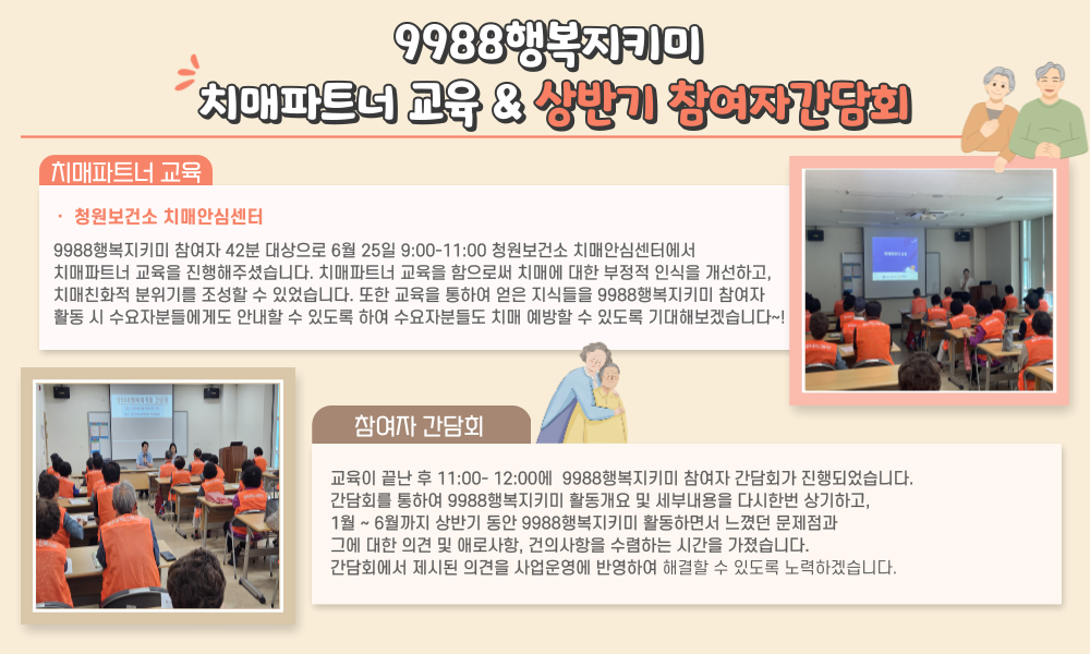 2024년 6월 25일 (화) 9:00-12:00 9988행복지키미 참여자분들 대상으로 치매파트너 교육 후 상반기 참여자간담회를 진행하였습니다~! 9:00-11:00에는 청원보건소 치매안심센터에서 치매파트너 교육을 진행해주셨습니다.