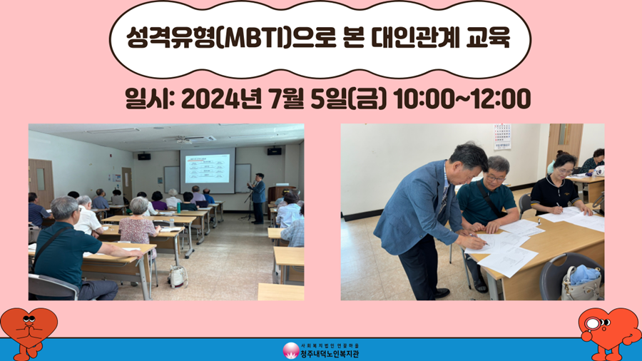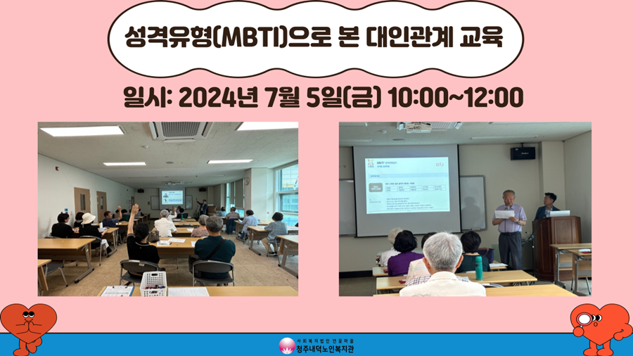 청주시평생학습관의 지원으로 찾아가는 청주시민학교 교육의 일환으로 7월 5일 금요일 10시복지관 2층 배움방에서 성격유형으로 본 대인관계 교육이 진행되었습니다. MBTI가 어떤 것인지에 대해 알아본 후 간이 검사지로 참여자분들의 성격 유형을 검사해보았으며, 각 성격 유형에 대해 살펴보고 그 성격유형에 해당하는 참여자가 본인이 생각하는 본인 성격의 장단점, 맞는 사람과 맞지 않는 사람, 내 성격에서 고치고 싶은 점에 대해 발표해보는 시간도 가지셨습니다. E와 I, S와 N 등 알파벳으로 구성된 낯선 단어들에 처음에는 유형에 대해서도 모르고 어리둥절하고 계시다가 강사님의 설명을 하나씩 들으면서 본인이 어떤 성격에 해당하는지를 알가실 수 있었습니다. 또한 사고(T)와 감정(F), 판단(J)와 인식(P)의 차이에 대한 이해를 돕기 위해 영화 장면을 바탕으로 등장 인물들의 성격 차이를 통해 더 쉽게 이해하실 수 있었습니다. 본인의 성격에 관련해서 발표하던 한 참여자는 "성격유형 내용을 살펴보니 내 모습을 거울로 보는 것 같다"고도 말씀하셨습니다. 원래 성격은 사람마다 다르니 서로 왜 그런 행동을 하는지에 대해 상대방의 성격을 들여보는 것이 필요한 것과 본인 성격의 단점들을 보완해나가고자 1가지라도 노력하는 것이 필요하다는 것을 강조하며 교육이 마무리 되었습니다. 오늘의 교육이 참여자분들이 스스로와 다른 사람의 성격을 알아가시는데 도움이 되셨기를 바라며 앞으로도 복지관 이용자분들이 다양한 분야에서의 지식을 습득 하실 수 있도록 노력하겠습니다!