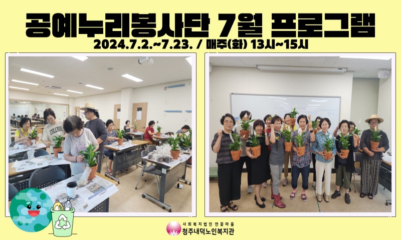 청주내덕노인복지관에서 진행하는 2024년 노인자율봉사활동사업 공예누리봉사단이 7월 원예교육 뿐 아니라 올바른 분리배출을 위한 부스운영, 원예 봉사활동 등 다양한 활동을 진행하였습니다.