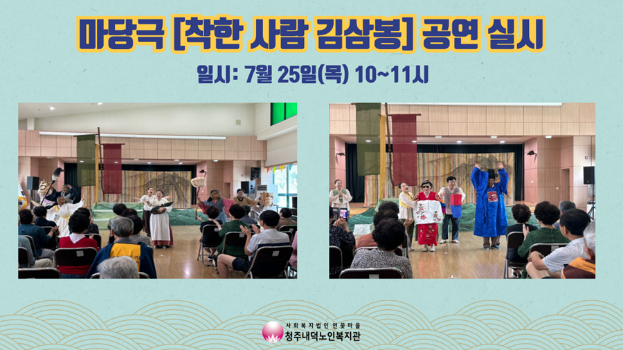 7월 25일(목) 10시 복지관 1층 강당에서 마당극 '착한사람 김삼봉' 공연이 진행되었습니다. 이번에는 공연팀 예술공장 두레에서 복지관을 방문하여 직접 공연을 선보여주셨습니다. 착한사람 김삼봉은 전통 판소리, 신명난 춤, 흥이 넘치는 우리 국악, 그리고 배우들의 맛깔스런 재담으로 구성되어, 우리나라의 미학 중 하나인 신명을 창출하는 공연입니다. 설명 그대로 공연 내내 관람객들의 눈과 귀를 즐겁게 해주셨으며, 공연 중간 중간에 관람객이 참여할 수 있는 요소를 넣어 더욱 몰입할 수 있도록 해주었고, 한 관람객을 공연에 참여하여 주인공 김삼봉의 아내로 깜짝 출연도 진행하였습니다. 1시간 동안 신명나는 즐거운 공연을 선보여준 예술공장 두레 팀에 감사드리며, 앞으로도 이용자분들이 다양한 문화예술을 경험해보실 수 있도록 노력하겠습니다!