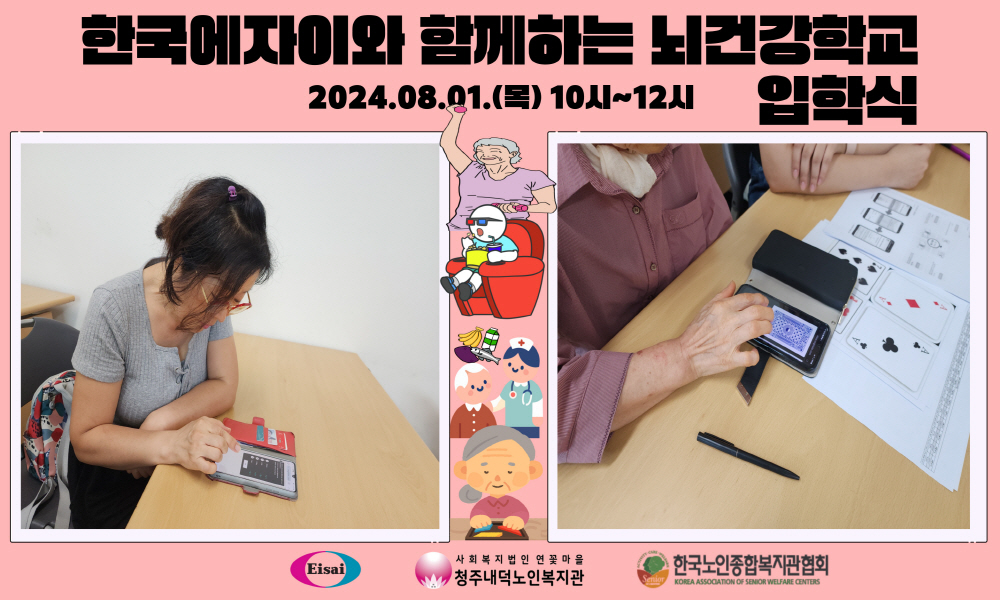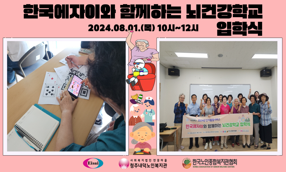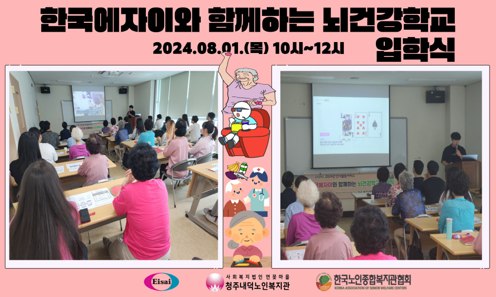 청주내덕노인복지관에서는 2024년 8월 1일(목) 오전 10시부터 2층 배움방에서 한국노인종합복지관협회와 한국에자이의 지원으로 운영되는 2024년 인지활동서비스 ‘한국에자이와 함께하는 뇌건강학교’ 입학식이 진행되었습니다.