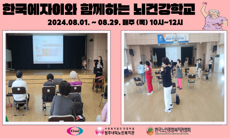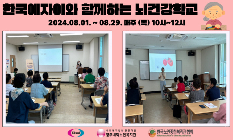 청주내덕노인복지관에서는 매주 목요일 오전 10시~12시까지 한국노인종합복지관협회와 한국에자이의 지원으로 2024년 인지활동서비스 '한국에자이와 함께하는 뇌건강학교'가 운영됩니다.