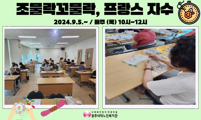 청주내덕노인복지관에서는 매주 목요일 10시~12시 평생학습우수프로그램지원사업인 조물락꼬물락, 프랑스자수 프로그램이 진행되었습니다.