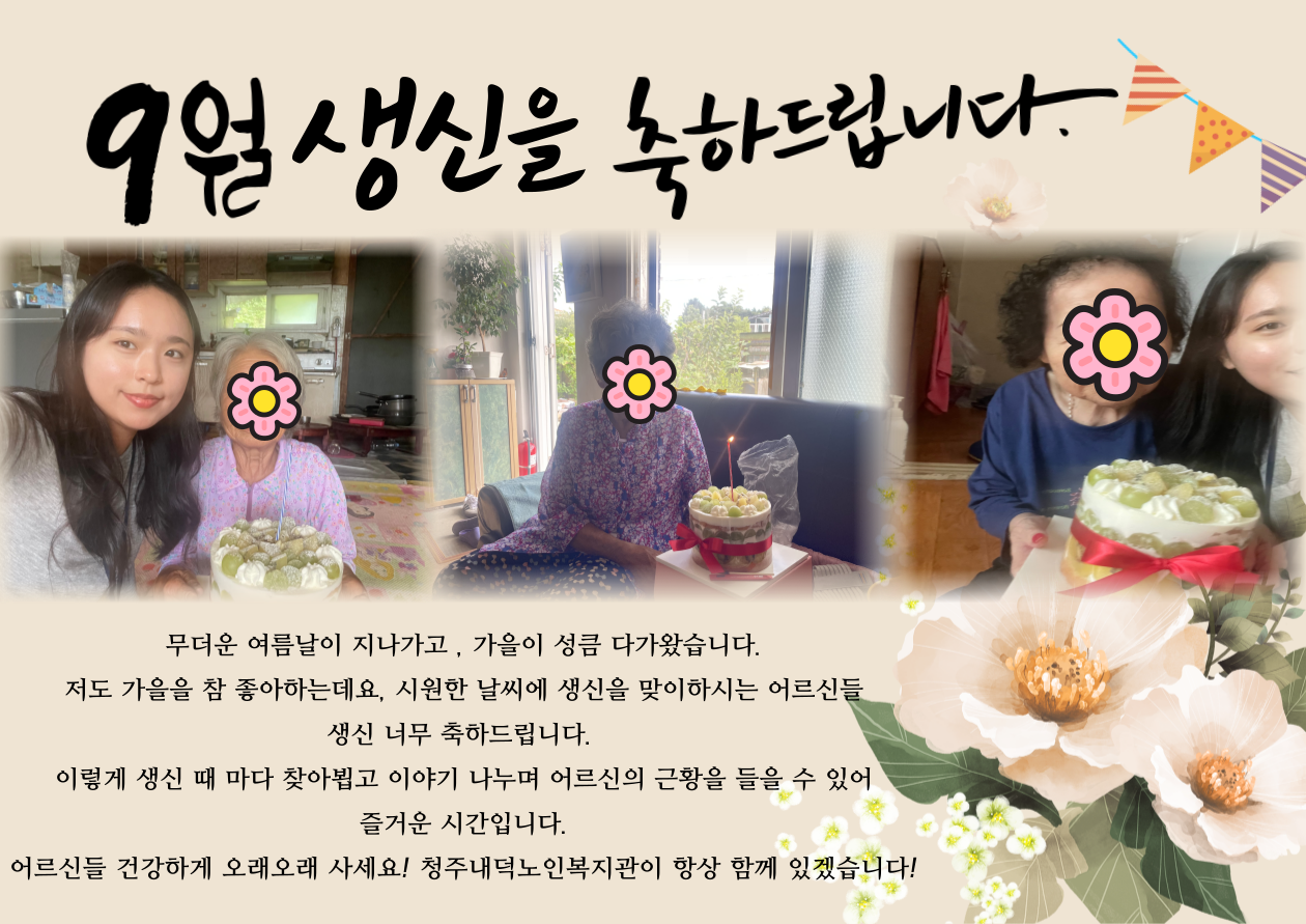 9월에 생신을 맞이하신 어르신들을 위해 생신지원서비스를 실시하였습니다. 무더운 여름이 지나가고 가을이 다가오고 있어 날씨가 선선합니다. 생신을 핑계삼아 어르신들 얼굴을 한번 더 뵐 수 있어 좋네요! 힘들거나 필요한 것이 있을 때 저희 청주내덕노인복지관을 생각해주시고 말씀해주셨으면 좋겠습니다. 생신을 맞이하신 어르신들 모두 생신축하드립니다 ~~!