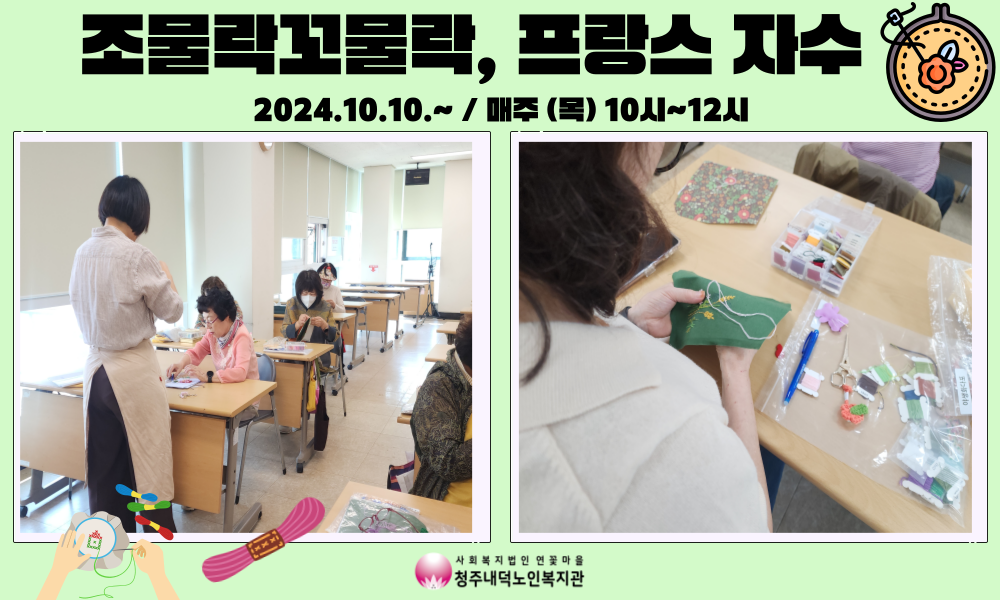 청주내덕노인복지관에서는 매주 목요일 10시~12시 평생학습우수프로그램지원사업인 조물락꼬물락, 프랑스자수 프로그램이 진행되었습니다.