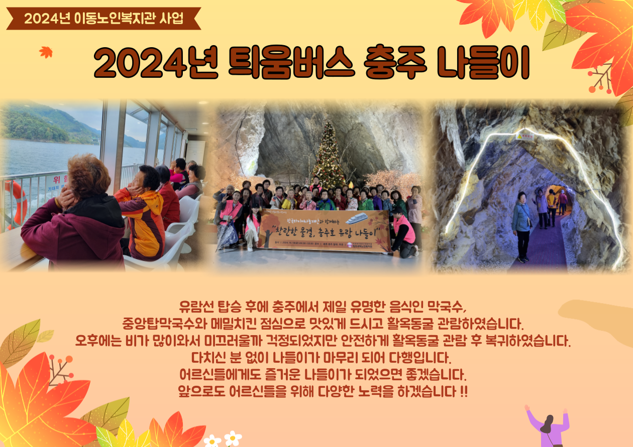 2024.10.18(금) 09:00~18:00 틔움버스 충주 나들이가 진행되었습니다. 충주호 크루즈 탑승과 활옥동굴 관람하였습니다. 충주호 크루즈 탑승 후 충주에서 유명한 충주중앙탑막국수와 메밀치킨을 점심으로 맛있게 드셨습니다. 다치신 분 없이 즐겁게 다녀와서 다행입니다. 앞으로도 어르신들을 다양한 활동을 위해서 노력하겠습니다. |