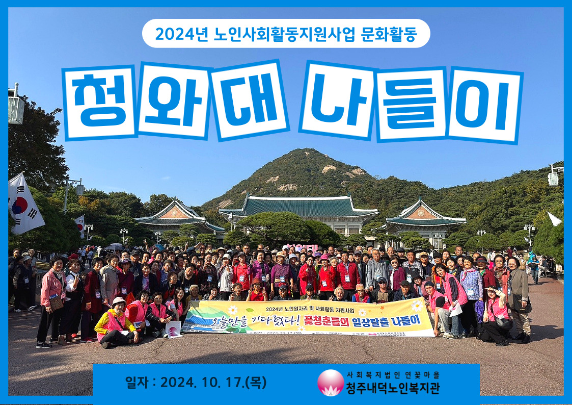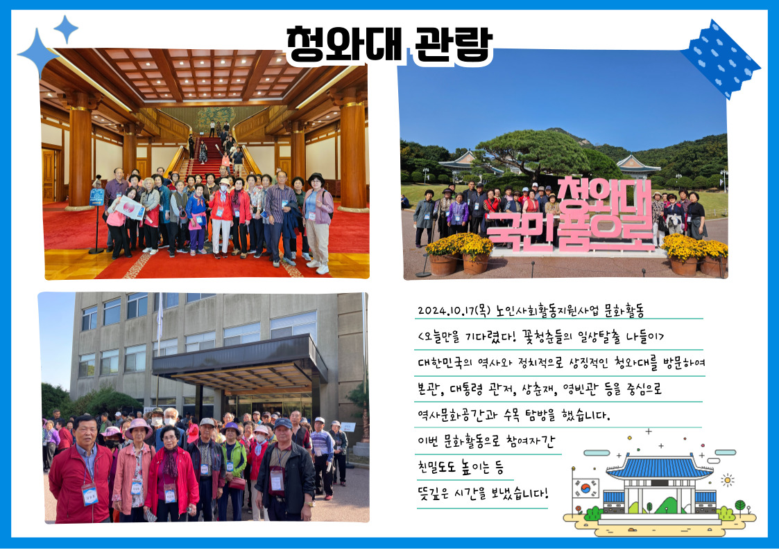 | 2024년 노인사회활동지원사업 문화활동 청와대 나들이 다녀왔어요! | |||