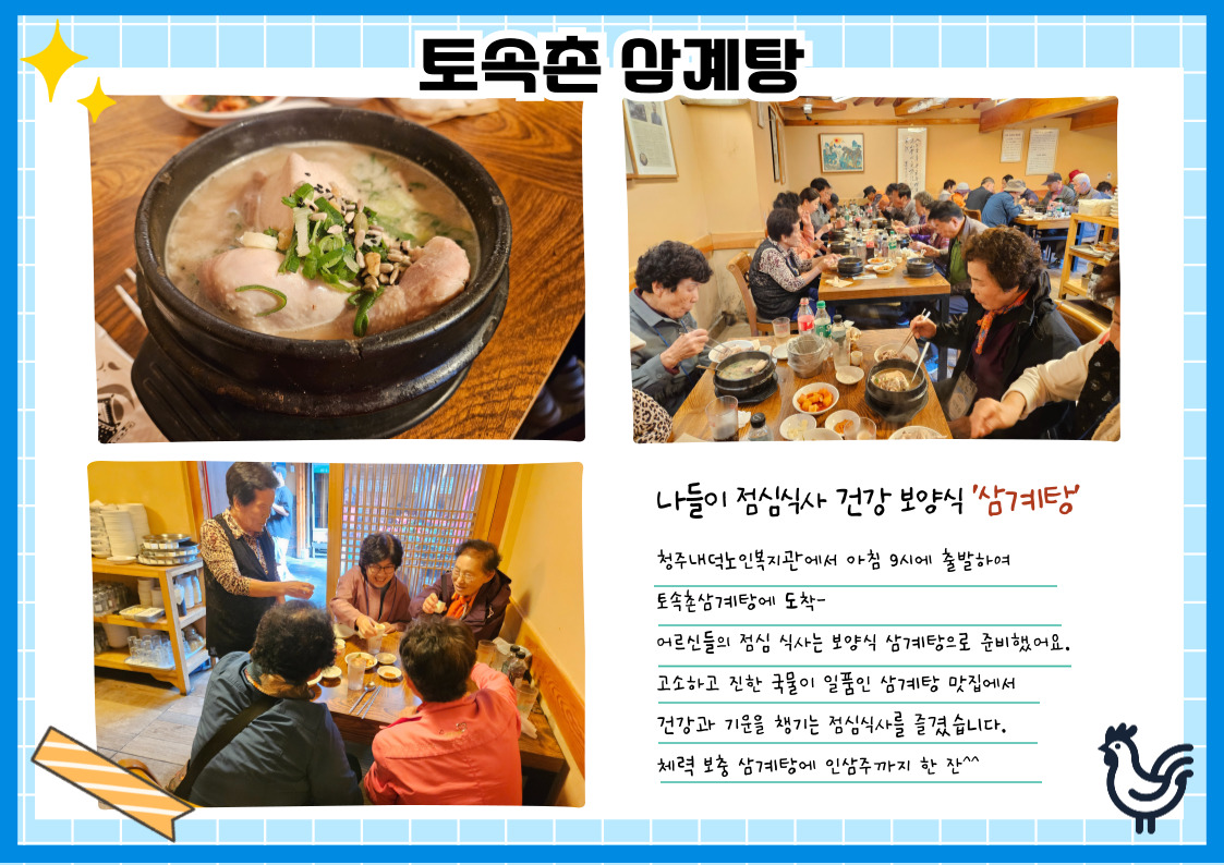 ![]() ![]() ![]() 2024.10.17(금) 2024년 노인사회활동지원사업 문화 활동으로 청와대 나들이 다녀왔습니다. 우리나라의 상징적인 역사 문화 공간인 청와대를 탐방하고, 서울 3대 삼계탕 맛집 '토속촌 삼계탕'에서 체력 충전할 수 있는 보양식으로 식사를 했습니다. 이번 문화 활동도 안전 사고 없이 순조롭게 마무리되어 어르신들도, 이번 나들이 활동을 준비한 저희들도 기분 좋게 좋은 추억 담아올 수 있었습니다.