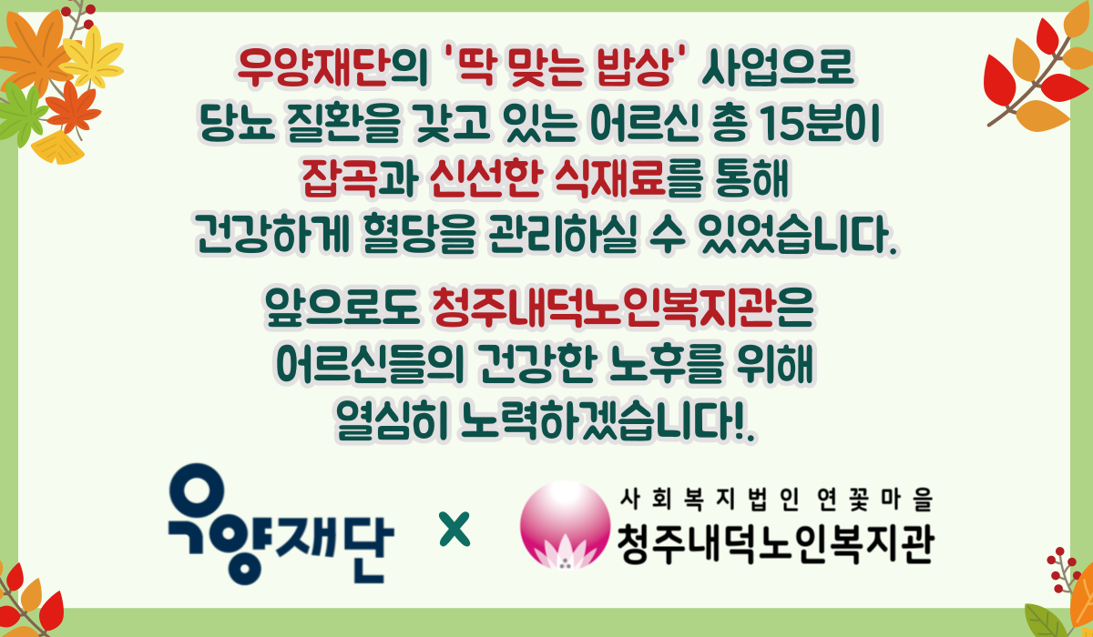 청주내덕노인복지관에서는 5월부터 10월까지 총 6회기에 걸쳐 우양재단에서 지원하는 노인성 질환 맞춤형 먹거리 지원사업 "딱 맞는 밥상" 프로젝트를 실시하였습니다. 지난 20여 년 동안 '꼭 필요한 이웃'에게 '좋은 먹을거리'를 나누기 위해 다양한 먹거리 지원사업을 펼치고 있는 우양재단 덕분에 당뇨와 당뇨합병증을 앓고 계신 어르신들이 건강한 식생활에 한걸음 더 다가갈 수 있게 되었습니다. 이제 잡곡이 안 들어가면 맨쌀밥이 맛 없다며 앞으로도 잡곡을 꼭 넣어드시겠다는 어르신, 혈당측정기를 통해 혈당수치를 눈으로 확인하게 되니 식사량을 조절하기가 편해졌다는 어르신, 혈당관리에 좋은 식재료들을 모아서 효능에 대해 알고 먹으니 더 건강해지는 기분이 들었다는 어르신, 모두 우양재단의 '딱 맞는 밥상' 사업 이후에도 건강을 잘 관리하고자 하는 다짐을 나타내주셨습니다.