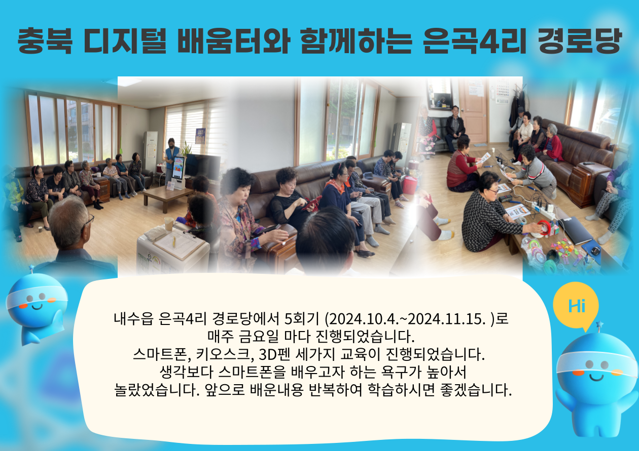 충북 디지털 배움터에서 진행하는 "에듀버스" 키오스크, 스마트폰, 3D펜 교육 프로그램이 진행되었습니다. 저희는 찾아가는 이동노인복지관 사업으로 은곡4리 경로당에서 일주일에 한번 수업으로 총 5회기 진행되었습니다. 어르신들이 처음엔 스마트폰 사용이 어려워 수업에 소극적인 모습을 보였으나, 수업이 진행되면서 점점 적극적인 모습도 보이고 흥미로워 하시는 모습도 보였습니다. 하지만 전 수업때 배웠던 내용들을 잊어버리기 일쑤였습니다. 다음엔 5회기 보다 더 많은 회기로 진행하여 본인의 것으로 만들어 가실 수 있도록 노력하겠습니다.