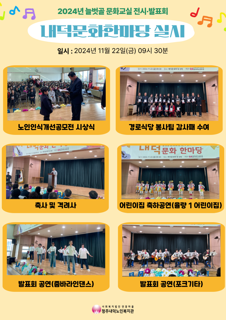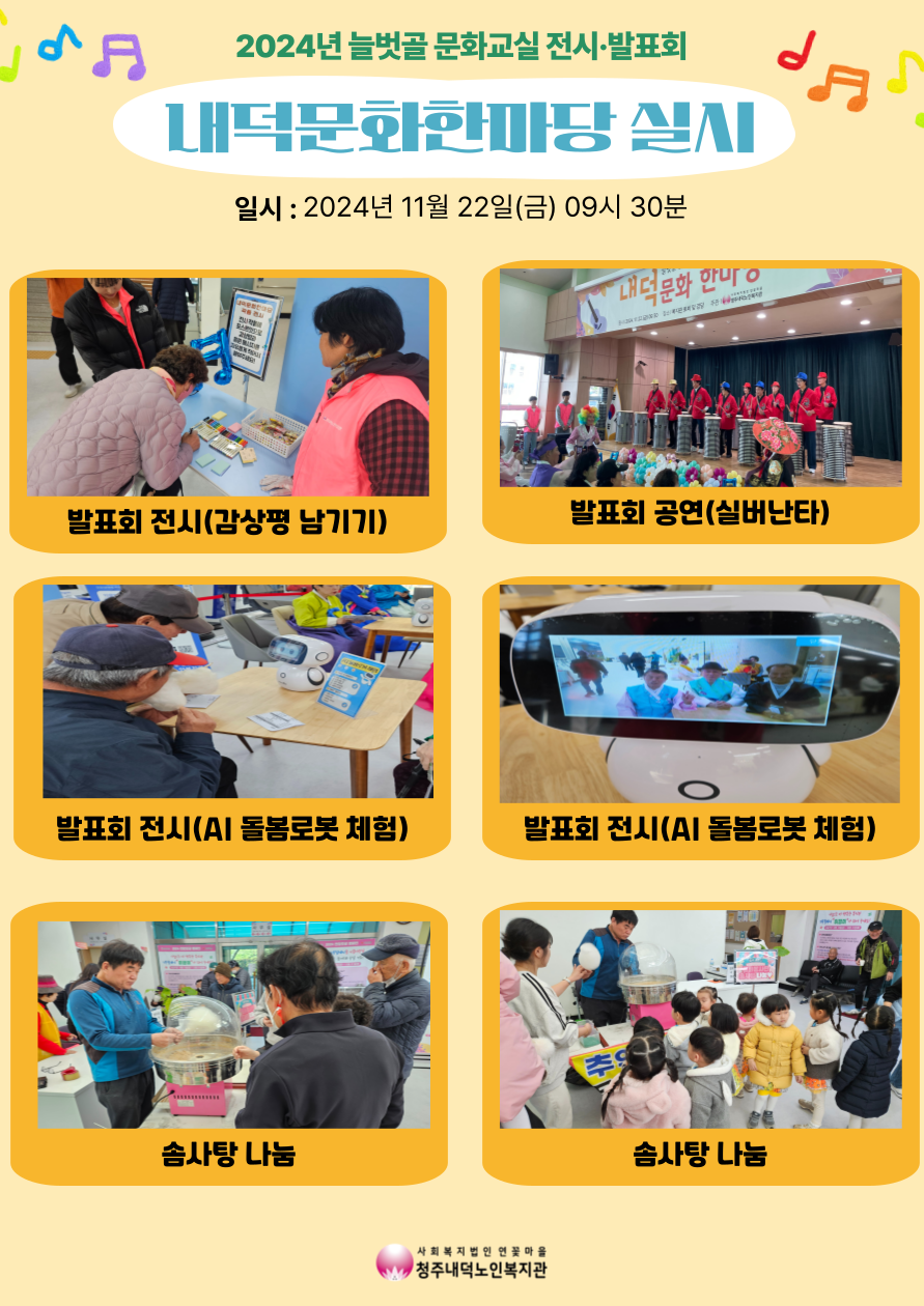 지난 22일(금) 9시 30분 복지관 1층 강당 및 로비에서 2024년 늘벗골 문화교실 발표회 내덕문화한마당이 실시되었습니다. 발표회 공연 전에 앞서 경로식당 운영에 늘 도움을 아끼지 않는 경로식당 전체 18개의 봉사팀을 대상으로 감사패를 수여하였으며, 노인인식개선공모전에서 심사결과 당선된 아동 2명에 대한 시상도 함께 진행되었습니다. 또한 율량 1 어린이집에서 열심히 발표회를 준비한 참여자분들을 응원하고자 예쁜 옷과 함께 축하공연을 진행해주어 모두의 웃음꽃을 피우게 해주셨습니다. 본 발표회에서는 올 한해 늘벗골 문화교실을 수강하시면서 갈고 닦으신 실력을 뽐내시기 위해 공연 10팀, 전시 2팀이 참여하였으며, 또한 문화교실 이외에 다른 다양한 사업들에서 참여자분들이 제작한 작품들도 함께 전시되어 더 다채로운 행사가 되었습니다! 전시와 더불어 전시 작품 감상평 및 응원 메시지 남기기, AI 돌봄 로봇 체험, 솜사탕 나눔도 진행되었습니다 발표회를 준비하느라 애써주신 강사님과 수강생 및 모든 분들께 감사드리며, 내년에도 이용자분들이 다양한 여가 문화 생활을 누리실 수 있도록 노력하겠습니다!