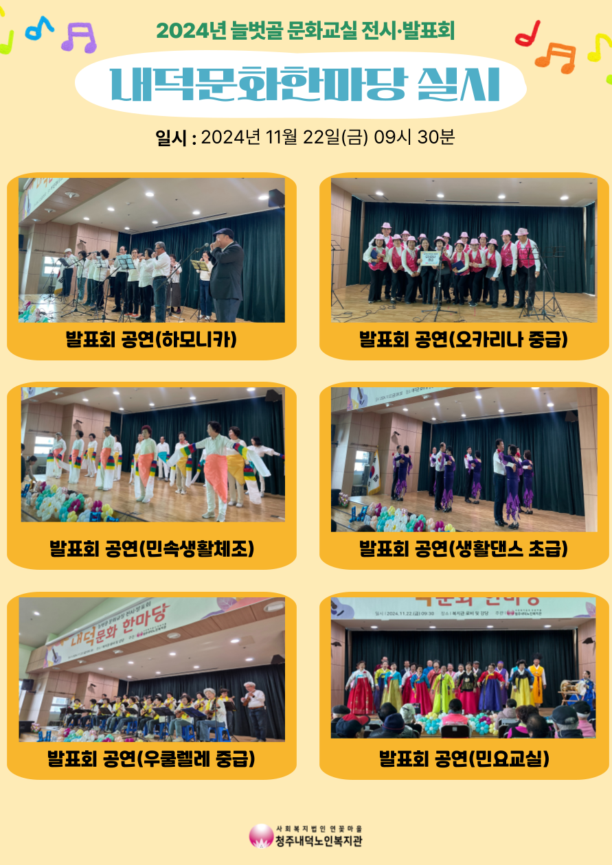 | 2024년 노년사회화교육사업 늘벗골 문화교실 발표회 내덕문화한마당 실시 | |||