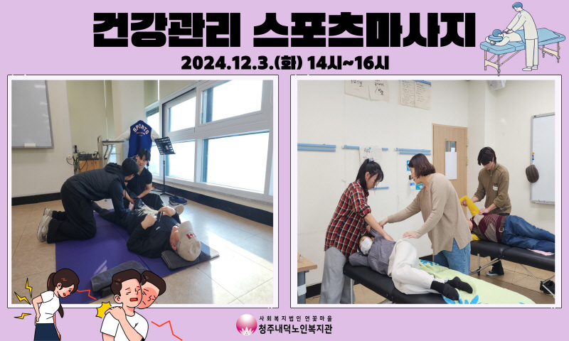 2024년 12월 3일(화) 오후2시30분부터 3시30분까지 청주내덕노인복지관 2층 으뜸방에서 청주대학교 스포츠재활학과 김정현교수님 그리고 스포츠재활학과 학생들과 함께 건강관리 스포츠마사지가 진행되었습니다.
