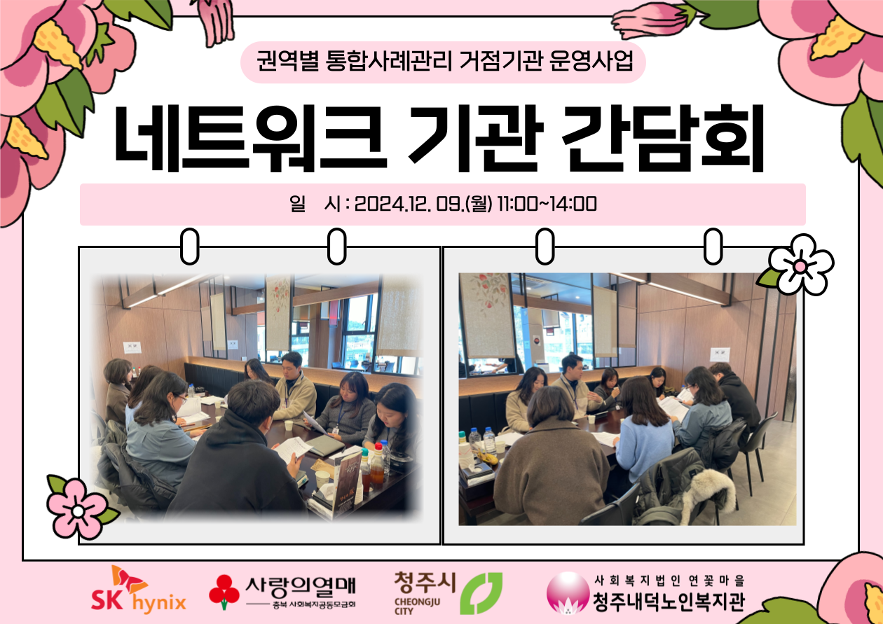 청주내덕노인복지관에서는 2024년 12월 9일 11시부터 14시까지 권역별 통합사례관리거점기관 운영사업을 추진하고 있는 3개 복지관이 모여 효과적인 통합사례관리 방법을 강구하고, 더 나은 사업으로의 발전을 위해 청주북부종합사회복지관, 목령종합사회복지관과 함께 간담회를 진행하였습니다.