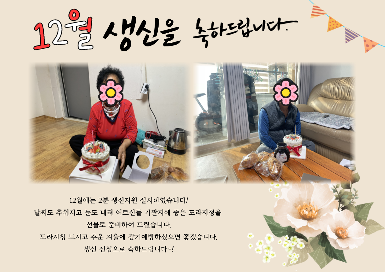 12월 17일 2분 생신지원 실시하였습니다~! 추운 날씨에 어르신들 감기 걸리실까 걱정되어 도라지청 선물로 드렸습니다~! 감기에 걸리시더라도 따뜻한 차 드시며 얼른 나으셨으면 좋겠습니다. 건강 관리 잘 하시고 생일 진심으로 축하드립니다~!