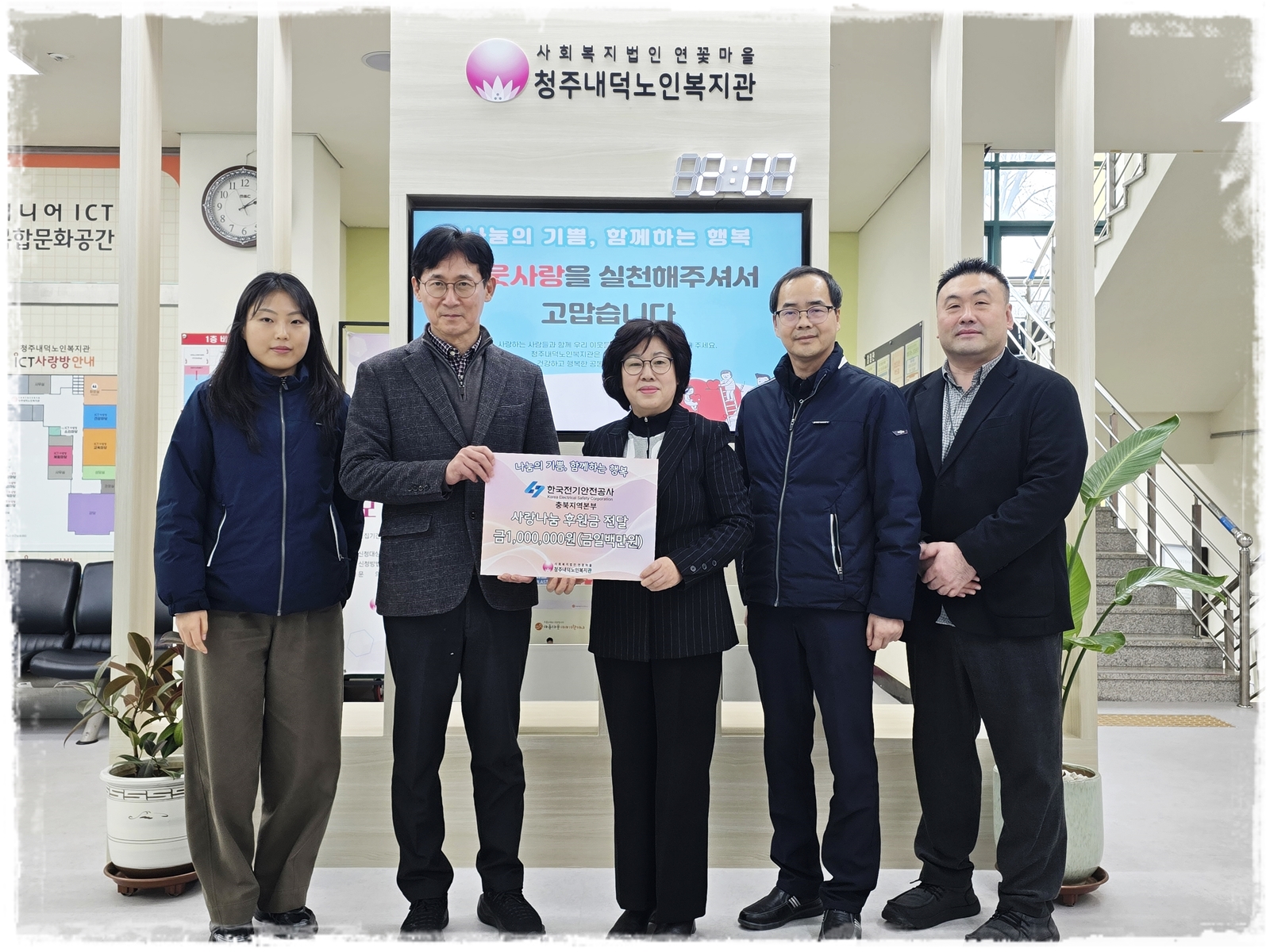 2025/1/22(수) 청주내덕노인복지관에서는 한국전기안전공사 충북지역본부(본부장 심재원)의 후원금 전달이 있었습니다. 직원분들이 십시일반 모은 큰 정성 100만원을 전해주셨습니다. 한국전기안전공사 충북지역본부는 매년 지역 상생과 취약계층 지원 등의 따뜻한 나눔을 실천하고 있습니다. 모아주신 정성은 홀몸노인 분들에게 꼭 필요하고 가치있는 서비스로 제공될 예정입니다.