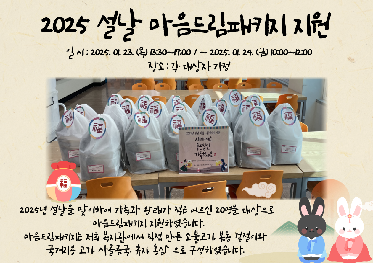 2025년 설날을 맞이하여 가족과 왕래가 적은 저소득 독거 어르신 20명을 대상으로 '설날 마음드림패키지'를 전달하였으며, 이번 지원은 고독감을 줄이고 생활 만족도 향상을 위해 기획하였습니다.