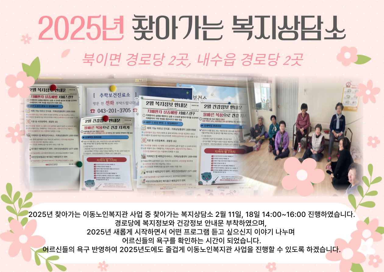 2025년 찾아가는 이동노인복지관사업 중 찾아가는 복지상담소 2월 11일, 2월 18일 14:00~16:00 까지 진행하였습니다. 복지정보와 건강정보 안내문 부착 및 설명 드렸으며 2025년 이동노인복지관사업으로 진행했으면 하는 프로그램 여쭙고 이야기 나누며 어르신들의 욕구를 확인하는 시간을 가졌습니다. 어르신들의 욕구 반영하여 2025년에도 즐거운 프로그램을 진행할 수 있도록 노력하겠습니다~