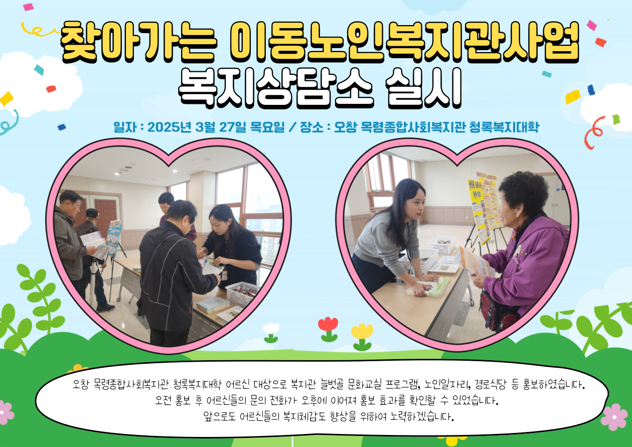2025년 찾아가는 이동노인복지관사업 찾아가는 복지상담소로 오창 목령종합사회복지관 청록복지대학에서 진행하였습니다. 청록복지대학 시작 전에 복지관 관련하여 홍보하였는데요, 오후에 어르신들의 문의 전화가 이어져 홍보 효과를 확인할 수 있었습니다. 앞으로도 어르신들의 복지체감도 향상을 위하여 노력하겠습니다.