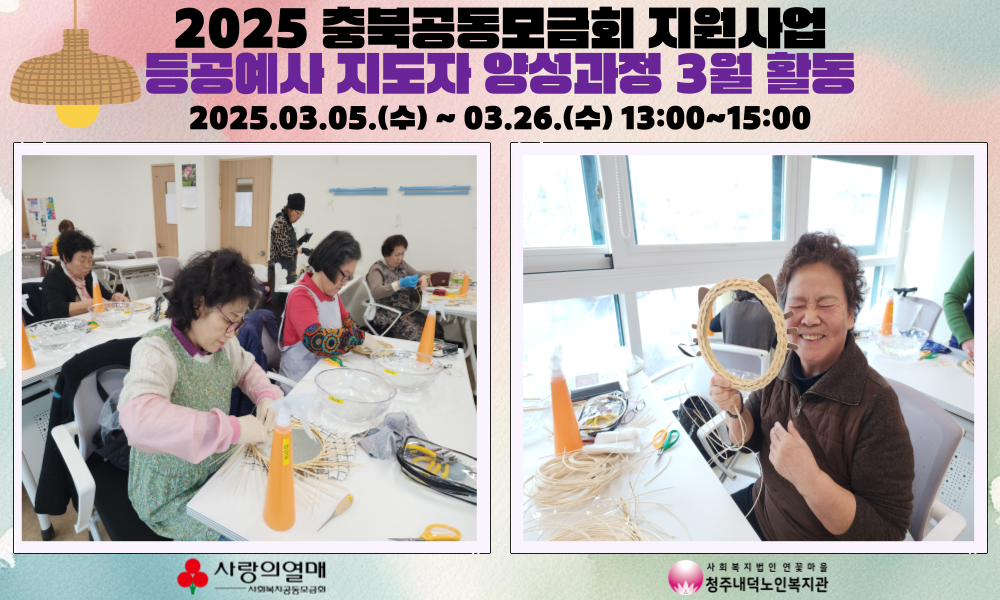 2025년 3월 5일부터 26일까지, 매주 수요일 오후 1시~3시까지는 청주내덕노인복지관 2층 으뜸방에서 공동모금회지원사업인 탄탄대로! 라탄 등공예사 지도자 양성과정 교육이 진행되었습니다. 3월에는 원형 굽접시 뿐 아니라 2가지 종류의 라탄 거울, 이중구조바구니 등을 만들며 완성해볼 수 있었습니다. 처음에는 등공예사 지도자 양성과정을 어려워하였지만 참여자들의 속도에 맞춰 천천히 진도를 나갈 수 있었으며 참여자들 또한 스스로 해내보고자 하는 의욕응ㄹ 보일 수 있었습니다. 탄탄대로! 등공예사 지도자 양성과정에서 4월에는 또 어떤 작품을 만들어보일지 많은 관심 가져주세요