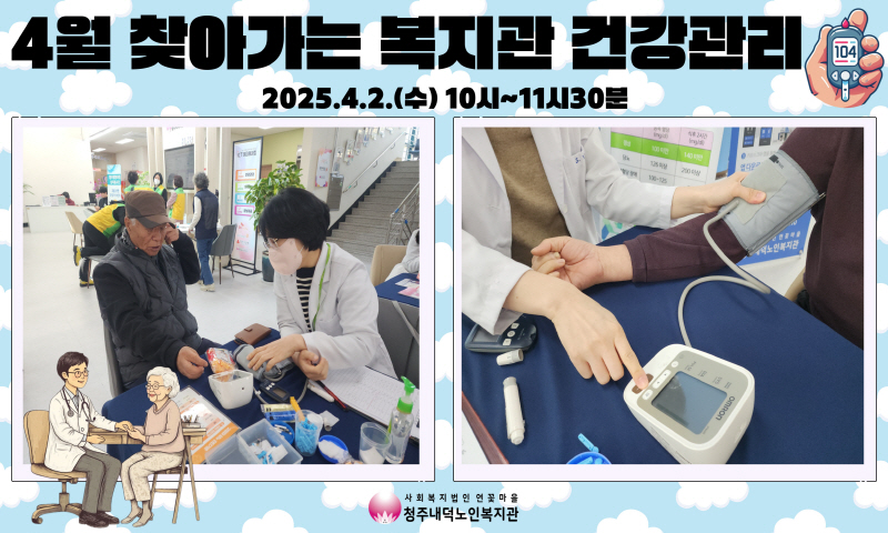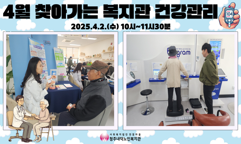 청주내덕노인복지관에서는 매월 첫번째 수요일 10시부터 11시30분까지 찾아가는 복지관 건강관리가 진행되니 앞으로 많은 관심과 참여 부탁드리겠습니다.