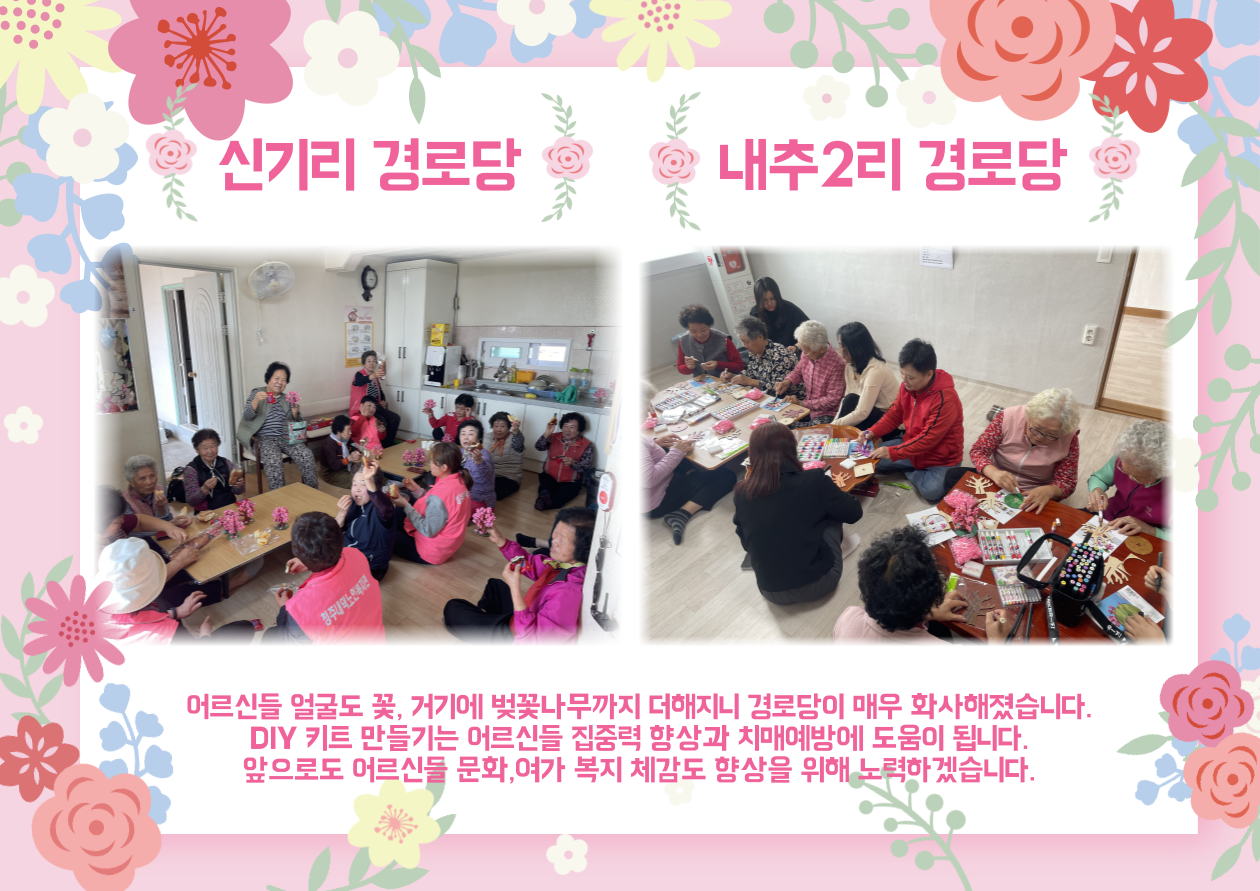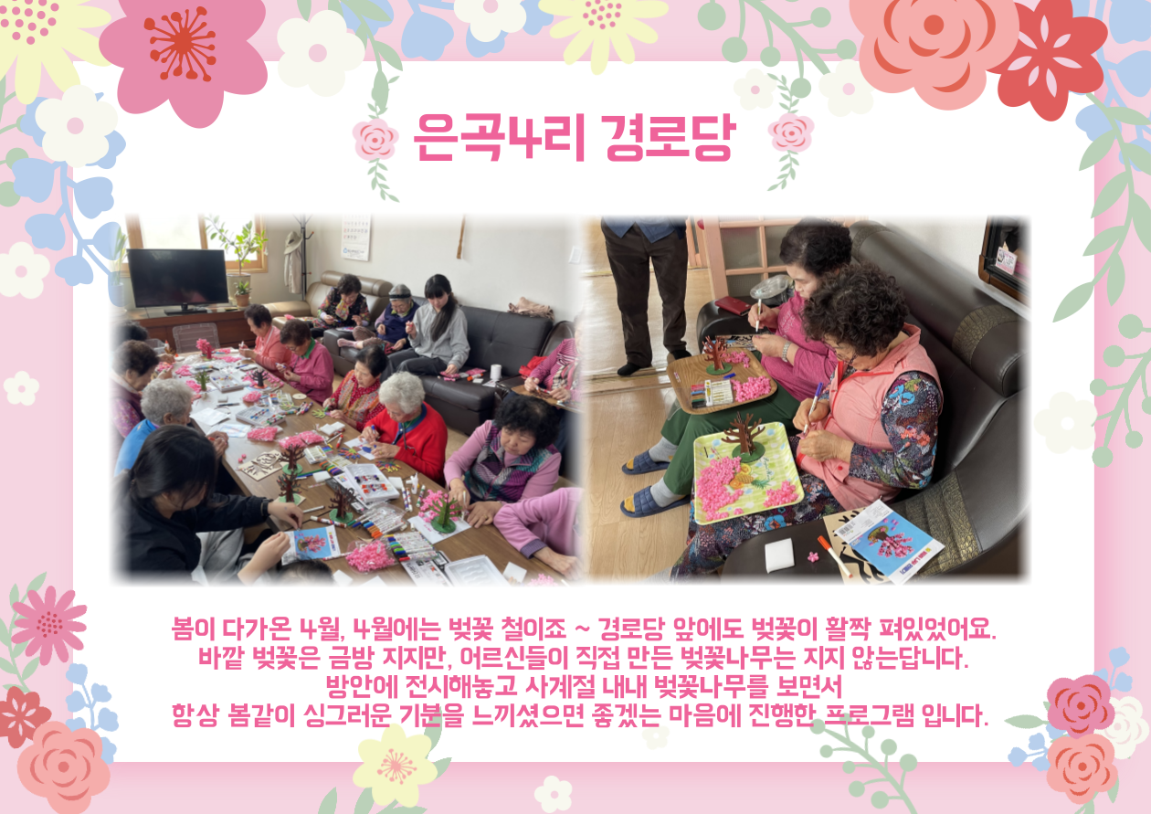 2025년 찾아가는 이동노인복지관사업 4월 경로당 프로그램으로 '봄 벚꽃나무 만들기' 진행하였습니다. 봄을 맞이하며 벚꽃 만들기를 기획하였습니다. 벚꽃이 져도 어르신들이 직접 만드신 벚꽃나무를 보면서 항상 싱그러운 기분을 느끼셨으면 좋겠습니다. 어르신들도 벚꽃나무 결과물을 보고 매우 만족하셨습니다. 앞으로도 어르신들의 복지체감도 향상을 위해 다양한 프로그램을 기획하도록 하겠습니다. 감사합니다.