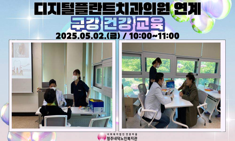 2025년 5월 2일(금) 10시~11시 청주내덕노인복지관 2층 으뜸방에서 디지털플란트치과의원과 함께 구강 건강교육을 진행하였습니다.
