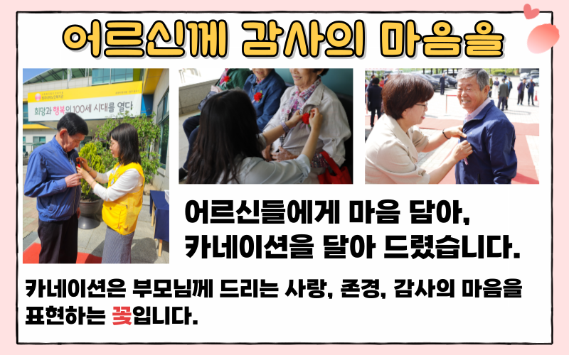 복지관에 오시는 어르신 한 분 한 분께 카네이션을 달아드리며 감사의 마음을 전했습니다. 또한 따뜻한 점심식사와 함께 기념품도 함께 전달되어 “오늘 정말 행복했다”는 말씀을 곳곳에서 들을 수 있었습니다.