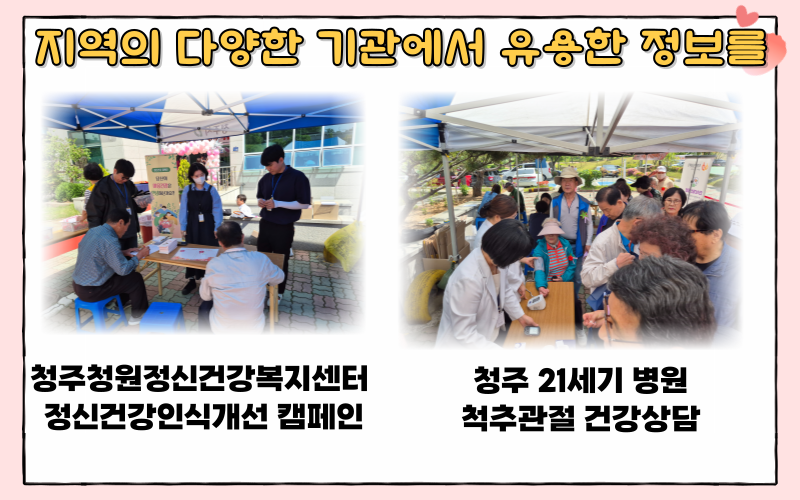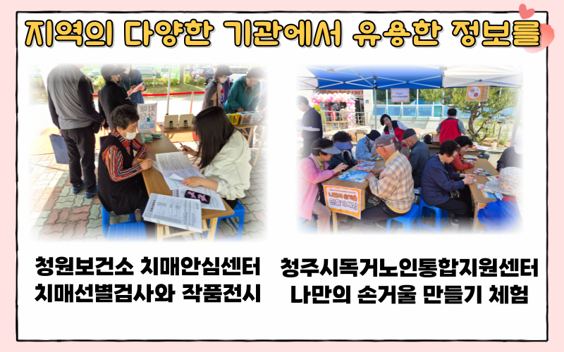 이번 행사는 동청주신협, 청주우천축산물불고기, 우리들기업에서 후원해주셨고, 청주시독거노인통합지원센터, 청주시주거복지센터, 청원보건소 치매안심센터, 청주청원정신건강복지센터, 21세기 병원 등 여러 지역 기관과 단체의 협력으로 더욱 풍성하게 진행되었습니다.