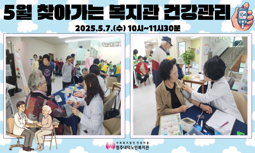5월 청원보건소와 함께 진행한 찾아가는 복지관 건강관리는 혈압 및 혈당 검사와 영양상담 결핵 간이 검사, 마약 예방 캠페인이 진행되었습니다. 혈압 및 혈당 검사 후 영양상담 까지 함께 진행을 할 수 있었으며 결핵 간이 검사를 통해 추후 결과를 안내해드릴 수 있도록 하였습니다. 청주내덕노인복지관에서는 매월 첫번째 수요일 10시부터 11시30분까지 찾아가는 복지관 건강관리가 진행되니 앞으로 많은 관심과 참여 부탁드리겠습니다.