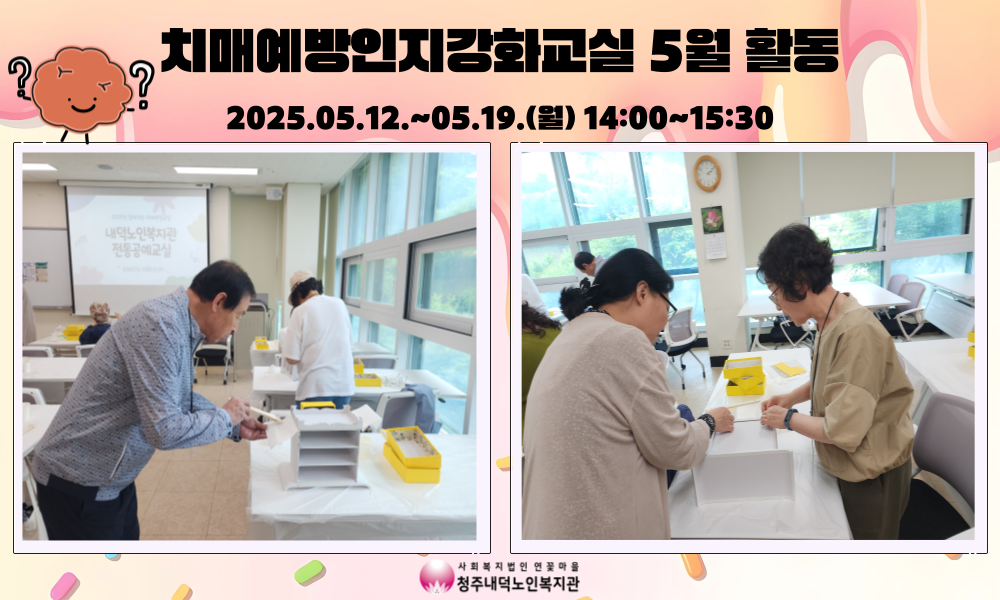 2025년 치매예방인지강화교실 5월 프로그램 진행 청주내덕노인복지관에서는 청원보건소 치매안심센터와 함께 매주 월요일 오후 2시부터 3시30분까지 치매예방인지강화교실 프로그램이 진행되었습니다.
