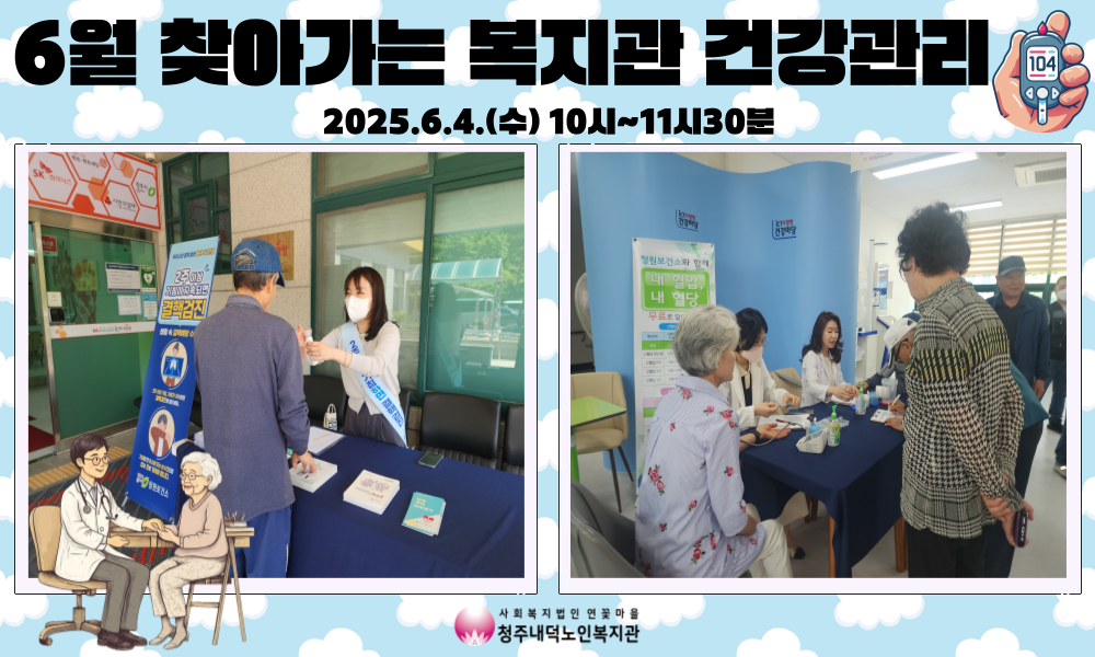 청주내덕노인복지관에서는 6월4일(수) 10시부터 11시30분까지 복지관 1층 로비에서 청원보건소와 함께하는 건강생활지원사업인 찾아가는 복지관 건강관리가 진행되었습니다. 6월 찾아가는 복지관 건강관리는 혈압 및 혈당 검사와 결핵 간이검사가 진행되었습니다. 조금씩 뜨거워지는 날씨에도 많은 이용자들이 찾아주었습니다. 청주내덕노인복지관을 이용하시는 이용자분들이 조금 더 건강을 관리할 수 있도록 다음달에도 청원보건소와 함께 찾아오겠습니다 매월 첫번째 수요일 10시에 진행되니 7월 2일(수), 청주내덕노인복지관 1층 건강마당에서 만나요