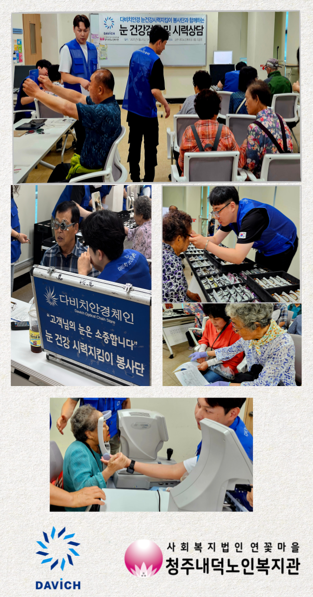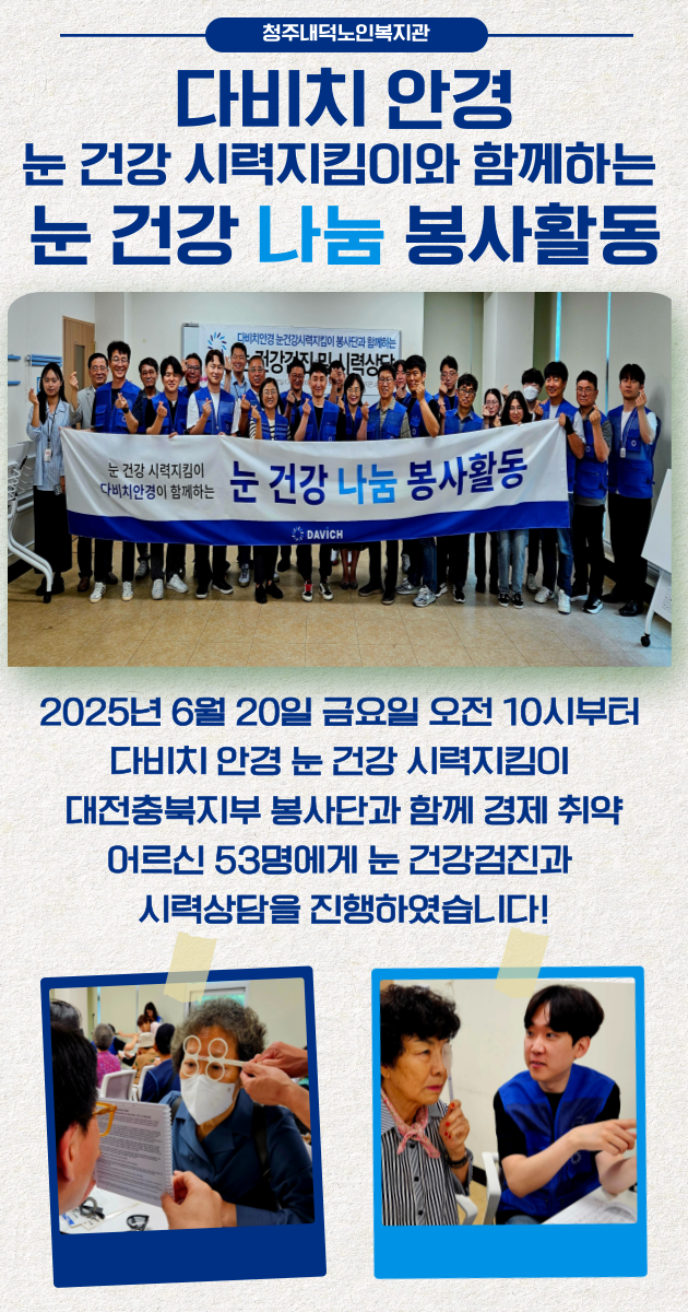청주내덕노인복지관은 2025년 6월 20일(금) 오전 10시부터 다비치안경 대전·충북지부 눈 건강 시력지킴이 봉사단과 함께 경제적 취약 어르신 53명을 대상으로 『눈 건강 나눔 봉사활동』을 진행하였습니다.