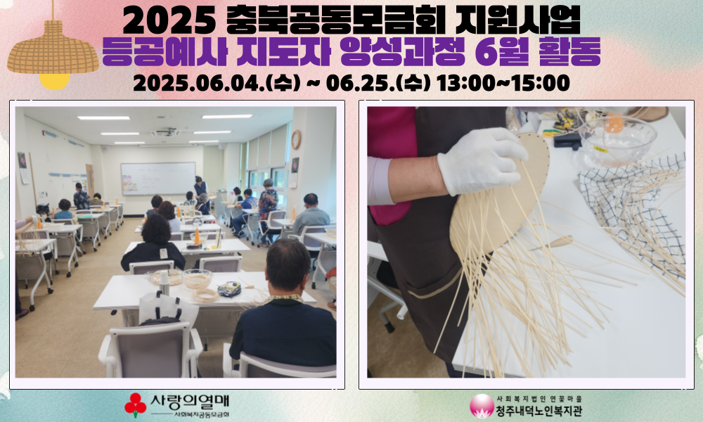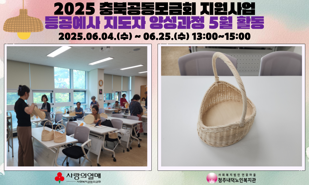 2025년 6월 4일부터 25일까지, 매주 수요일 오후 1시~3시 청주내덕노인복지관 2층 으뜸방에서 공동모금회지원사업인 탄탄대로! 라탄 등공예사 지도자 양성과정 교육이 진행되었습니다.