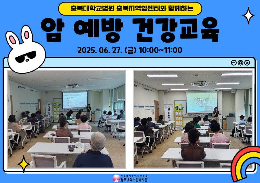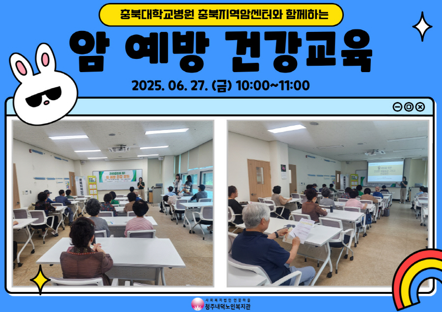 청주내덕노인복지관은 2025년 6월 27일 금요일, 2층 으뜸방에서 10시부터 11시까지 충북지역암센터, 청원보건소 건강증진팀과 함께 암 예방 건강교육이 진행되었습니다. 교육을 통해 암의 다양한 종류 뿐 아니라, 주 발생 원인과 내 몸을 건강하게 지켜나가는 방법 등 다양한 정보를 알아볼 수 있었습니다. 교육이 끝난 후 궁금한 사항을 질문도 하며 내가 알게 된 것에 대해서도 이야기를 나눌 수 있었습니다. 청주내덕노인복지관은 앞으로도 이용자들의 건강교육을 위해 다양한 건강교육을 준비할테니 많은 관심바라겠습니다.
