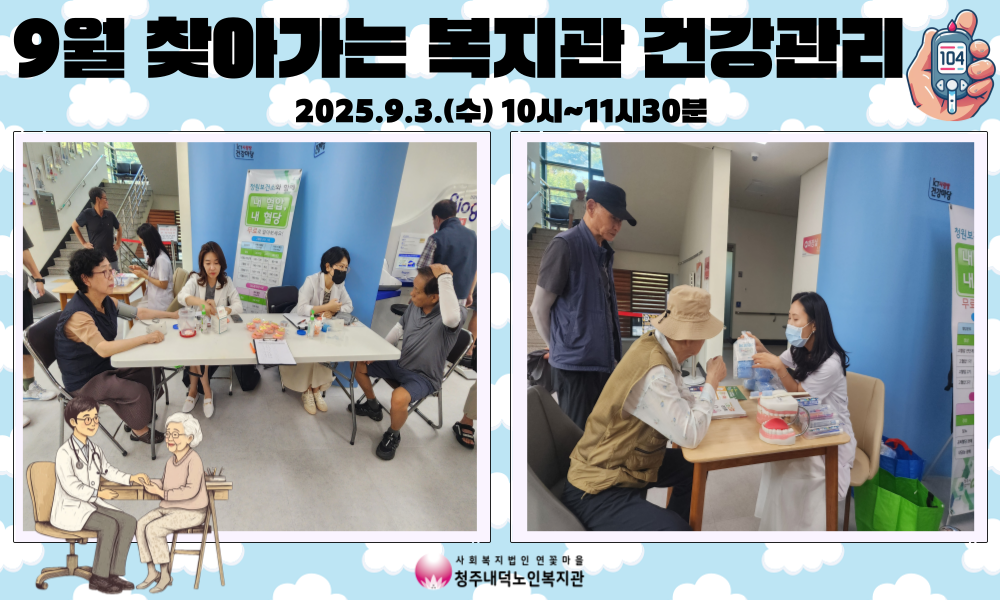 청주내덕노인복지관에서는 9월3일(수) 10시부터 11시30분까지 복지관 1층 로비에서 청원보건소와 함께하는 건강생활지원사업인 찾아가는 복지관 건강관리가 진행되었습니다. 9월 찾아가는 복지관 건강관리는 혈압 및 혈당 검사와 구강 상담이 진행되었습니다. 방학기간으로 8월 한 달 쉬었다가 진행되서인지 많은 이용자들이 혈압 및 혈당, 구강 상담을 받을 수 있었습니다. 매월 첫번째 수요일 10시에 진행되니는 찾아가는 복지관 건강관리가 10월, 11월 2회가 남았으니, 남은 시간 이용자들을 위해 열심히 달려가겠습니다. 10월 1일 수요일, 청주내덕노인복지관 1층 건강마당에서 만나요