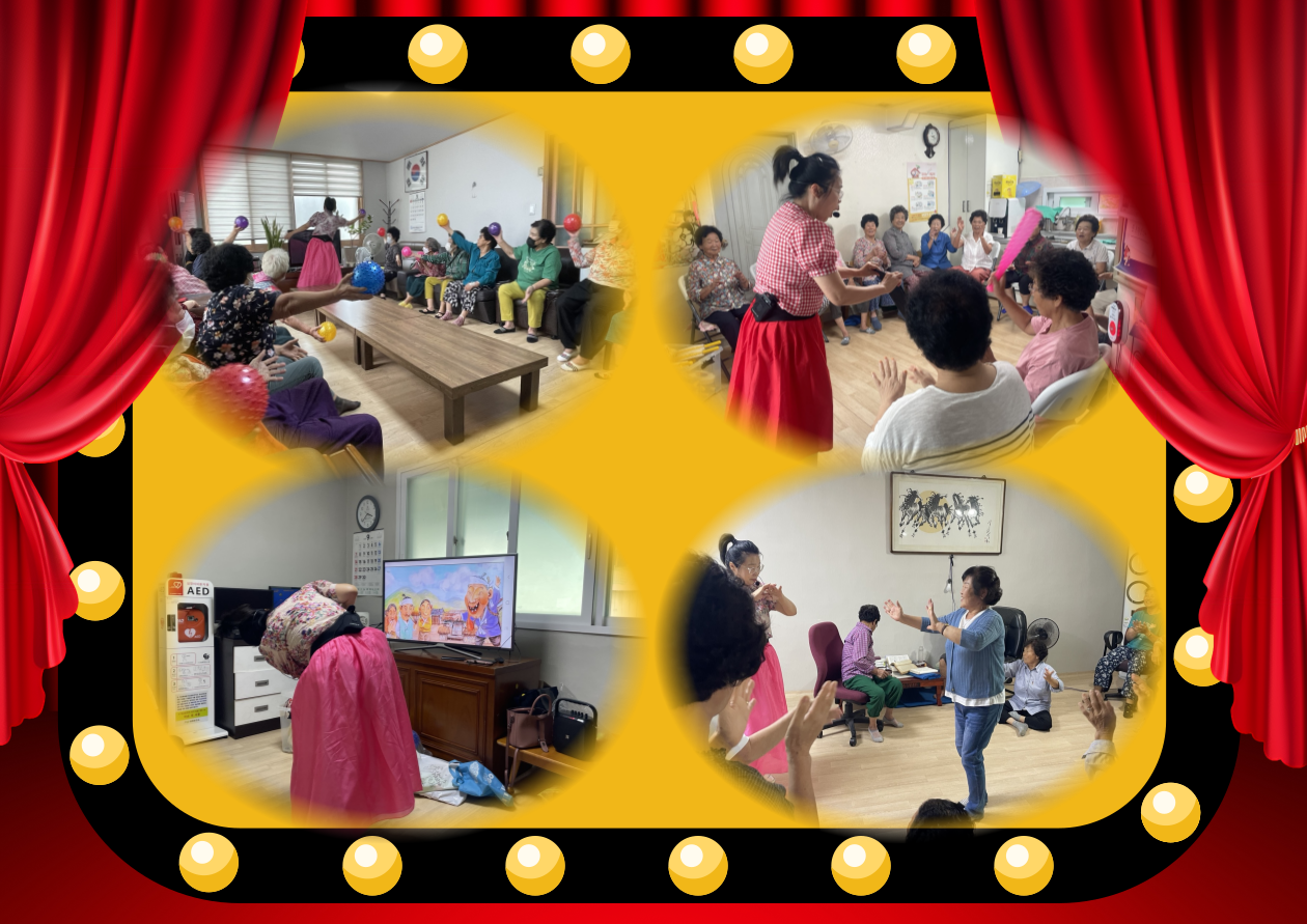 9월 8일 14:00~15:00 북이면 신기리 경로당, 9월 9일 14:00~15:00 내수읍 은곡4리 경로당, 9월 9일 15:30~16:30 내수읍 우산1리 경로당에서 찾아가는 이동노인복지관 사업 경로당 프로그램으로 웃음치료 동화구연 강사님을 초청하여 프로그램 진행하였습니다.