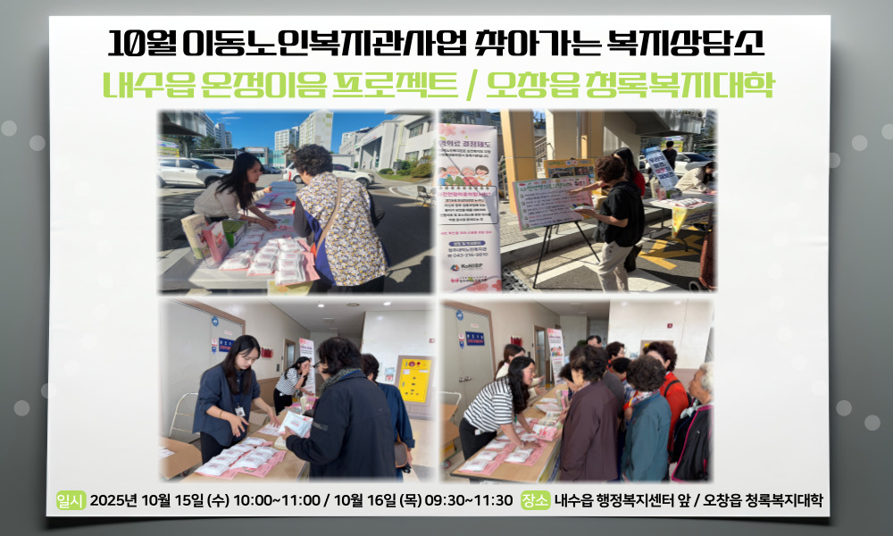 2025년 10월 이동노인복지관사업 찾아가는 복지상담소로 내수읍 온정이음 프로젝트와 오창읍 청록복지대학에서 실시하였습니다.