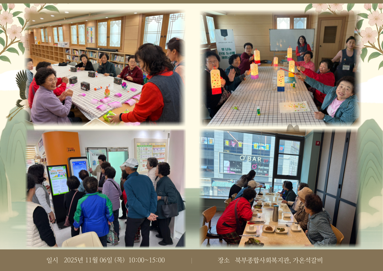 북부종합사회복지관에서 진행한 ‘빛 나눔 전통 등공예 체험교실’ 프로그램에 참여하여 어르신들과 함께 초롱등과 연꽃등 두 가지 등을 만들어보았습니다. 정성껏 만든 등이 집에서도 따뜻한 빛으로 활용되길 바랍니다. ✨
