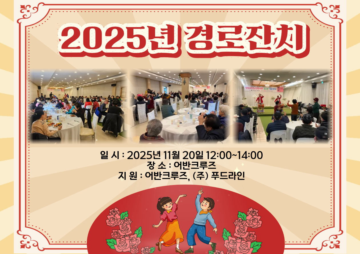 2025년 찾아가는 이동노인복지관사업, 지역사회돌봄 및 자원연계사업의 일환으로 경로잔치를 실시하였습니다 ~! 어반크루즈 식당, (주) 푸드라인에서 어르신 100명 대상으로 점심식사를 지원해주셔서, 내수읍 은곡4리 경로당, 우산1리 경로당, 북이면 신기리 경로당 어르신 50명 대상과 본 기관 재가서비스를 받고 계신 어르신 50명 대상으로 점심식사 지원할 수 있었습니다. 이후에는 신나라 공연단의 공연으로 진행되어 어르신들이 편안하게 식사하고 공연을 즐기며 서로 교류할 수 있는 시간이 되었습니다. 코로나 19 이후 대규모 경로잔치가 다시 개최하게 되어 매우 뜻깊고, 식사와 공연을 즐기며 어르신 얼굴에 웃음꽃이 피는 모습을 보니 더욱 기뻤습니다! 지원해주신 어반크루즈와 (주) 푸드라인 대표님께 감사드립니다.