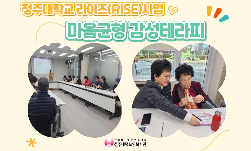 청주내덕노인복지관에서는 2025년 11월 26일(수) 청주대학교 라이즈(RISE)사업인 마음균형 감성테라피를 지하 1층 강의실에서 진행하였습니다. 마음 치유를 위한 감정 교육과 함께 과자를 활용한 푸드테라피를 진행하였습니다. 참여자들 또한 프로그램에 참여하면서 자신의 감정을 다시 돌아보며 편안한 마음을 가질 수 있었다고하였습니다. 내년에도 이용자들의 마음을 치유할 수 있는 프로그램으로 찾아뵙겠습니다.